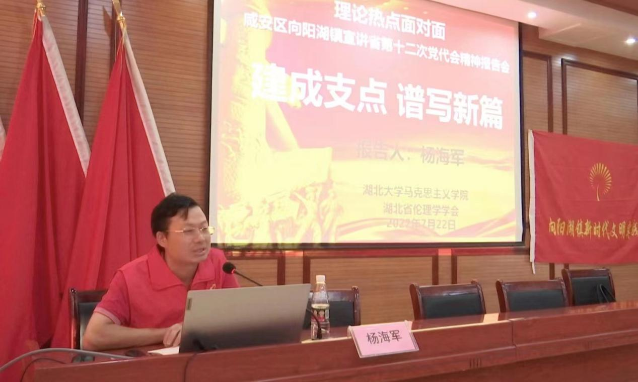 2022年7月22日,咸宁市咸安区向阳湖镇举行“学习贯彻习近平总书记考察湖北重要讲话精神,推进落实省第十二次党代会精神部署”专题会议。受湖北省伦理学学会会长戴茂堂教授的委托,学会党支部书记杨海军以《建成支点,谱写新篇》为题进行了理论宣讲。咸安区委宣传部副部长熊鸣、向阳湖镇党委书记陈伟、镇长周永定等全体镇干部、驻村工作队、镇直部门负责人、村两委成员参加会议。