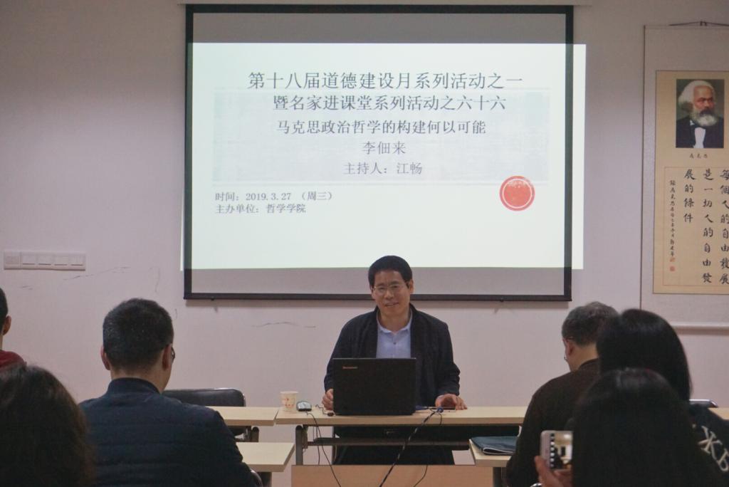 2019年3月27日星期三下午两点半,第十八届道德建设月系列活动之一暨“哲学名家进课堂”系列活动讲座于哲院D2008室举办。本期活动主讲人是武汉大学WILLIAMHILL在线体育投注李佃来教授,主题为“马克思政治哲学的构建何以可能”。公司部分师生共同聆听了此次讲座。