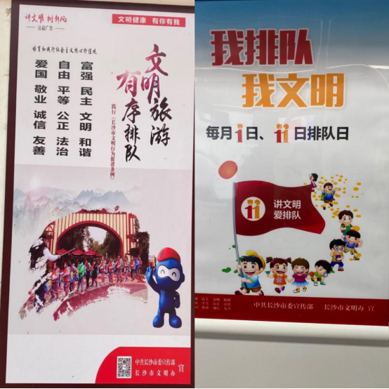 长沙作为一座著名的旅游城市,在诸多热门的旅游景点处还树立了许多宣传“排队”文明的标牌。