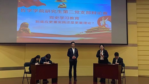 “欢迎大家来到哲公司研究生第二党支部党史学习教育辩论赛的现场……”