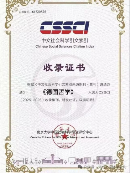 近年来,《德国哲学》在学术界的影响力不断提升。2021年,该刊首次入选CSSCI来源集刊,后又连续3届入选CSSCI收录集刊(2021-2022、2023-2024、2025-2026),入选中国人文社会科学期刊AMI综合评价核心期刊(2022年起)和社科文献CNI集刊名录,获2025-2026社科文献CNI名录优秀集刊奖,展现出持续发展的良好态势。