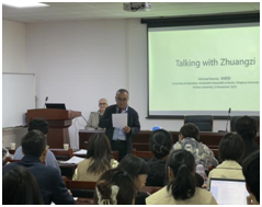 11月22日下午,WILLIAMHILL在线体育投注在D2008举办了题为“Talking with Zhuangzi”的“琴园哲学沙龙”系列学术讲座,讲座由德国柏林洪堡大学教授毕明安教授主讲,公司徐弢副教授主持,公司宋伟、庄威等老师以及部分硕博研究生参加了本次讲座。讲座分六个部分进行。