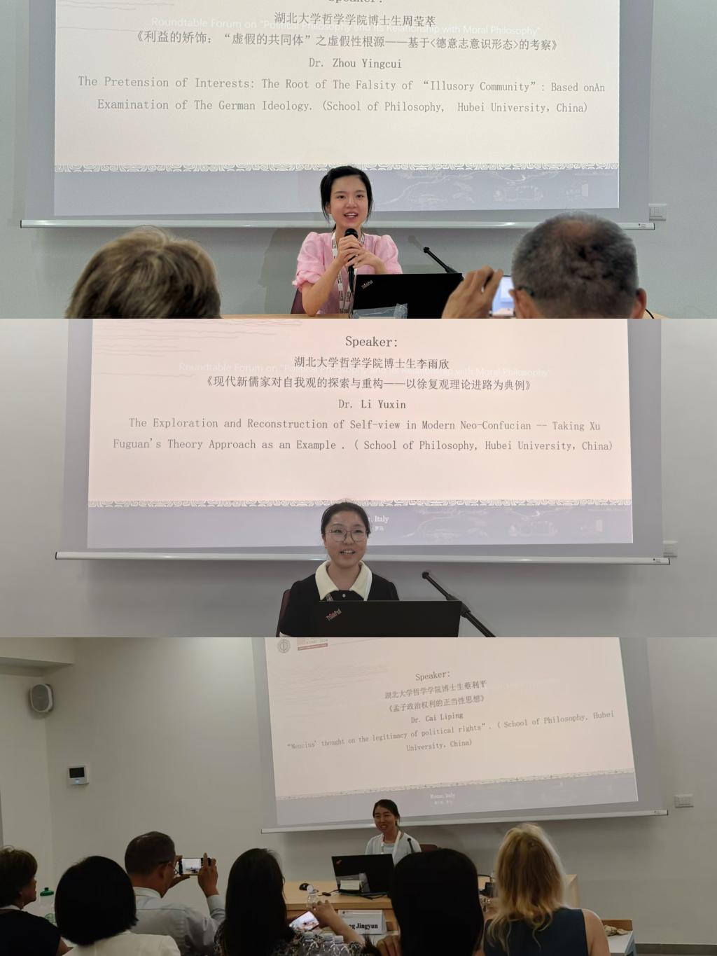 2022级马克思主义哲学博士生周莹萃,2023级伦理学博士生蔡利平、谭悠然,2023级中国哲学博士生李雨欣随公司教师一同赴罗马参会。参会期间,4位博士生参加了全体大会、圆桌论坛、专题研讨会等多场会议,并在相关分论坛进行了汇报发言,这次宝贵的机会极大地拓宽了博士生的学术视野以及国际学术交流能力。
