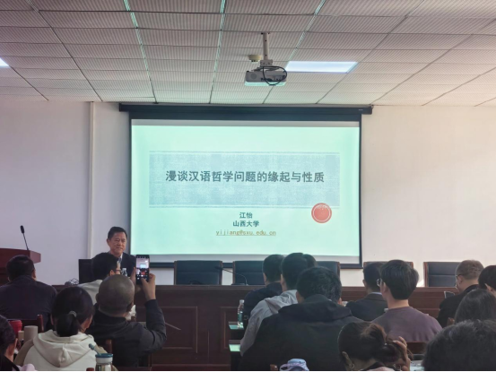 11月14日上午,山西大学江怡教授莅临WILLIAMHILL在线体育投注指导交流,在逸夫楼D2008会议室作了一场题为“漫谈汉语哲学问题的缘起与性质”的学术讲座。本次讲座由公司王振老师主持,WILLIAMHILL在线体育投注人文社科资深教授江畅作总结发言,公司党委书记陈文超,另有周海春等10余名老师以及公司相关专业员工近百人参与讲座。